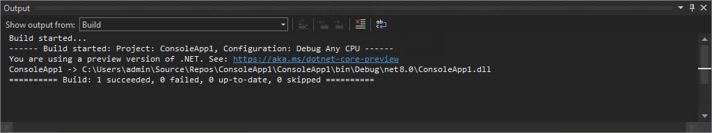 Let's build the project to see some build output. The Output window shows output messages from building your project and from your source control provider.
