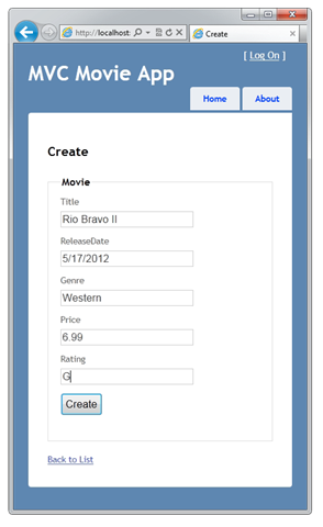 A continuación, abra el archivo \Views\Movies\Create.cshtml y agregue el siguiente marcado cerca del final del formulario. Esto representa un cuadro de texto para que pueda especificar una clasificación cuando se crea una película.