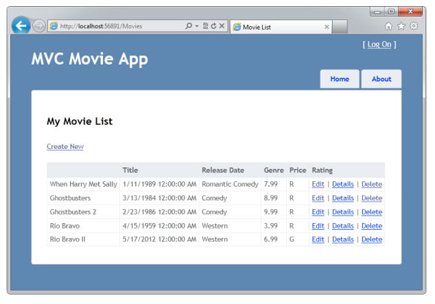 Vuelva a ejecutar la aplicación y vaya a la dirección URL /Movies. Cuando se inicia la aplicación, detecta que la estructura del modelo ya no coincide con el esquema de la base de datos. Vuelve a crear automáticamente la base de datos para que coincida con la nueva estructura del modelo y rellena la base de datos con las películas de ejemplo: