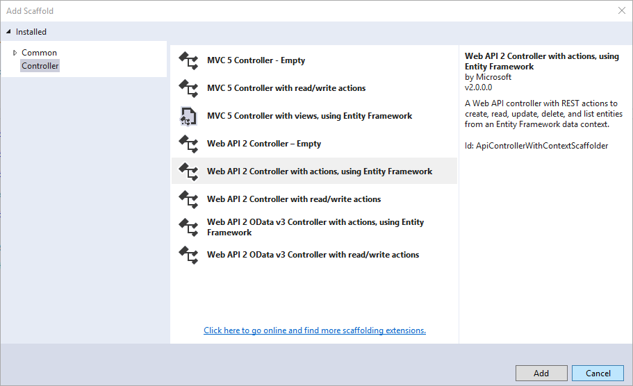 En el cuadro de diálogo Agregar scaffolding, seleccione Controlador de Web API 2 con acciones que usan Entity Framework.