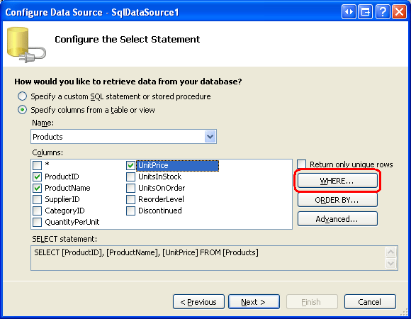 Después de agregar el parámetro, haga clic en Aceptar para volver al Asistente para configurar orígenes de datos. La SELECT instrucción de la parte inferior del asistente ahora debe incluir una WHERE cláusula con un parámetro llamado @UnitPrice: