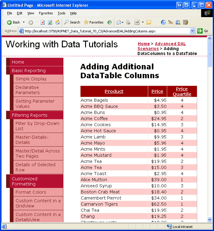 Con unas pocas líneas de código, podríamos ampliar el GridView para que coloree las filas de productos en función de su valor de PriceQuartile. Podríamos colorear esos productos en el primer cuartil un verde claro, aquellos en el segundo cuartil un amarillo claro, etc. Te animamos a que dediques un momento a agregar esta funcionalidad. Si necesita un repaso sobre cómo formatear el GridView, consulte el tutorial Formato personalizado basado en datos.