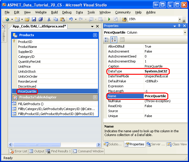 En la mayoría de los escenarios, todos los métodos de un TableAdapter devolverán el mismo conjunto de campos de datos, pero hay ocasiones en las que un método determinado o dos pueden necesitar devolver un campo adicional. Por ejemplo, en el tutorial Master/Detail Using a Bulleted List of Master Records with a Details DataList se ha agregado un método al CategoriesTableAdapter que, además de los campos de datos de la consulta principal, devolvió un NumberOfProducts campo que notificó el número de productos asociados a cada categoría. En este tutorial, vimos cómo agregar un método en ProductsTableAdapter que devuelve un PriceQuartile campo, además de los campos de datos de la consulta principal. Para capturar campos de datos adicionales devueltos por los métodos de TableAdapter, es necesario agregar las columnas correspondientes a DataTable.