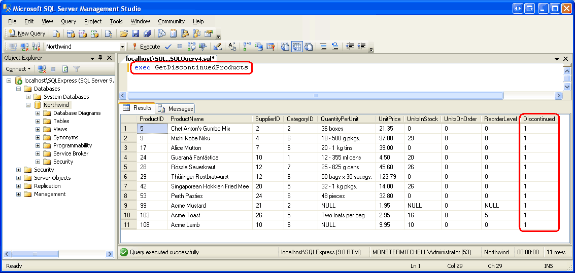 El procedimiento almacenado GetDiscontinuedProducts se muestra en la carpeta Procedimientos almacenados