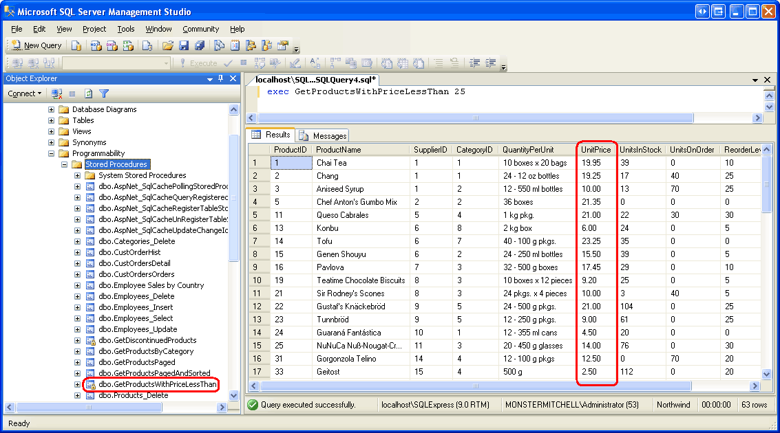 Después de ejecutar el script anterior, actualice la carpeta Procedimientos almacenados en el Explorador de objetos. Debería ver una nueva entrada de procedimiento almacenado, GetProductsWithPriceGreaterThan que tiene un icono de bloqueo junto a él. Para probar este procedimiento almacenado, escriba y ejecute el siguiente script en la ventana de consulta: