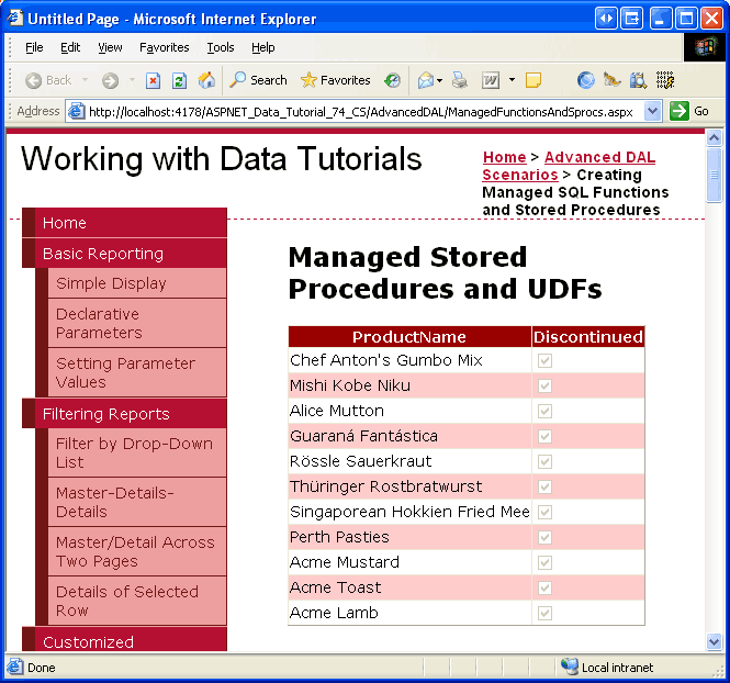 Los objetos de base de datos administrados son más adecuados para procedimientos almacenados y UDF que usan lógica de procedimientos en lugar de lógica basada en conjuntos. La lógica de procedimientos implica trabajar con conjuntos de datos por fila o trabajar con datos escalares. Sin embargo, el método GetDiscontinuedProducts que acabamos de crear no implica ninguna lógica de procedimientos. Por lo tanto, idealmente se implementaría como un procedimiento almacenado de T-SQL. Se implementa como un procedimiento almacenado administrado para mostrar los pasos necesarios para crear e implementar procedimientos almacenados administrados.