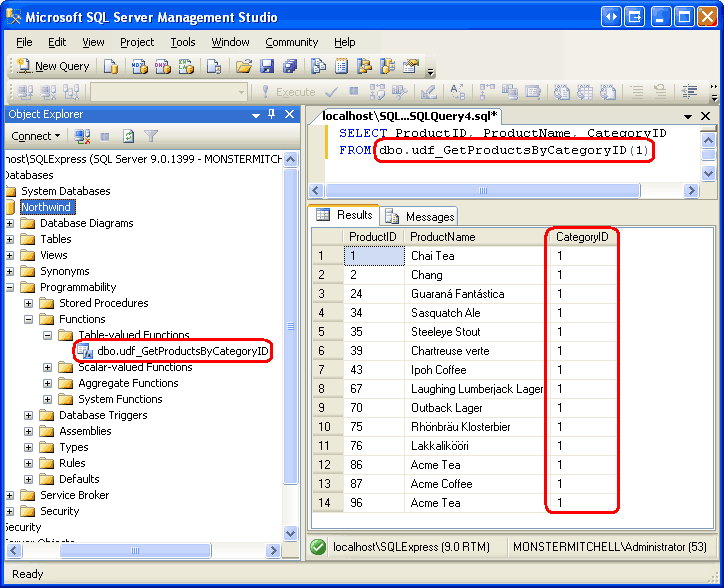 He agregado la udf_GetProductsByCategoryID UDF a la base de datos Northwind; En la figura 24 se muestra la salida de la consulta anterior SELECT cuando se ve a través de Management Studio. Las UDF que devuelven datos tabulares se pueden encontrar en la carpeta Funciones Table-value del Explorador de objetos.