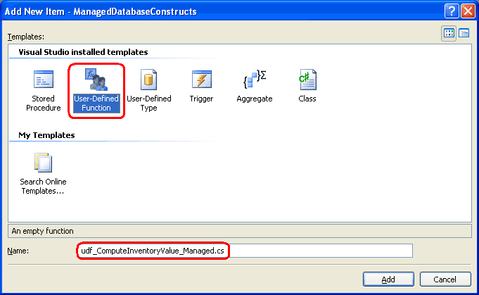 Para agregar una UDF administrada al proyecto ManagedDatabaseConstructs, haga clic con el botón derecho en el nombre del proyecto en el Explorador de soluciones y elija Agregar un nuevo elemento. Seleccione la plantilla definida por el usuario en el cuadro de diálogo Agregar nuevo elemento y asigne al nuevo archivo UDF el nombre udf_ComputeInventoryValue_Managed.cs.