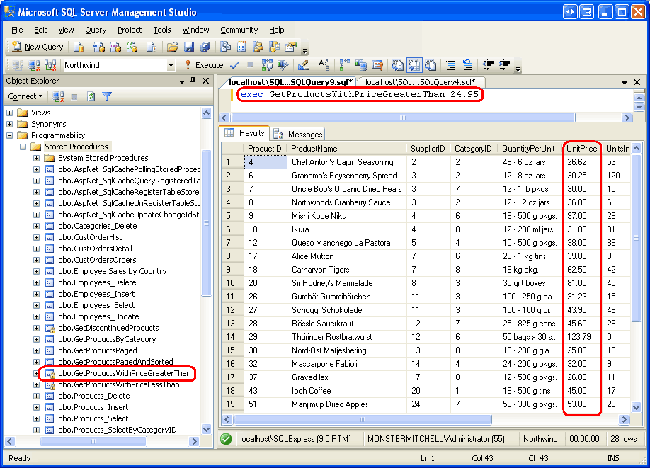 Aunque hemos agregado el ensamblado a la base de datos Northwind, todavía tenemos que asociar un procedimiento almacenado con el método GetProductsWithPriceGreaterThan en el ensamblado. Para ello, abra una nueva ventana de consulta y ejecute el siguiente script: