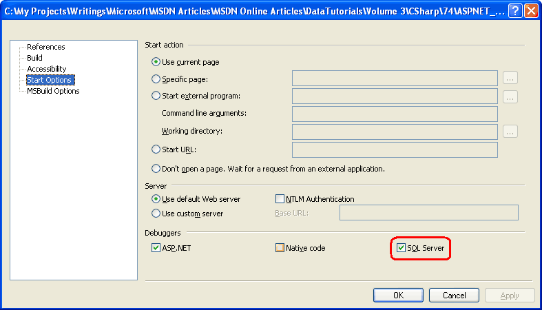 Para empezar a depurar procedimientos almacenados llamados desde la aplicación, es necesario indicar a la aplicación web ASP.NET que se integre con el depurador de SQL Server. Para empezar, haga clic con el botón derecho en el nombre del sitio web en el Explorador de soluciones (ASPNET_Data_Tutorial_74_CS). Elija la opción Páginas de propiedades en el menú contextual, seleccione el elemento Opciones de inicio de la izquierda y active la casilla SQL Server en la sección Depuradores (vea la figura 3).