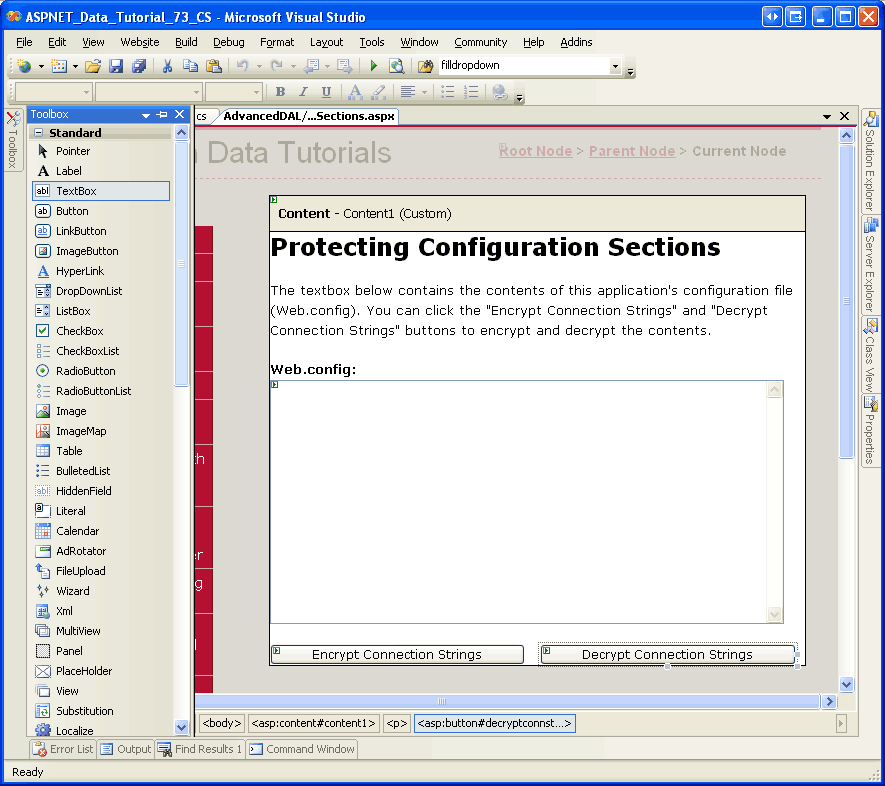 Captura de pantalla que muestra Visual Studio abierto a la página de EncryptingConfigSections.aspx, que tiene un nuevo control TextBox y dos botones.