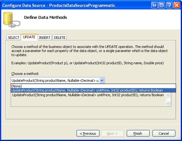 Configure el ObjectDataSource para usar la clase ProductsBLL y en la pestaña SELECT, establezca la lista desplegable en GetProducts(). En la pestaña UPDATE, elija la UpdateProduct sobrecarga con tres parámetros de entrada: productName, unitPrice, y productID. Establezca las listas desplegables en (Ninguno) en las pestañas INSERT y DELETE.