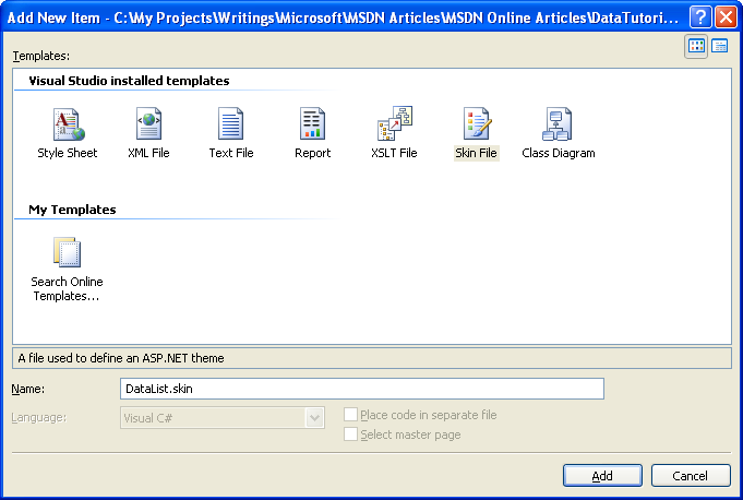 Figura 10: Crear un nuevo archivo de máscara denominado DataList.skin (haga clic para ver la imagen de tamaño completo)