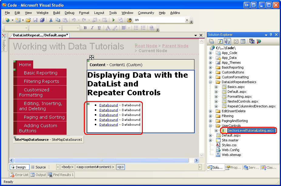 Paso 1: Adición de las páginas web de los tutoriales sobre DataList y Repeater