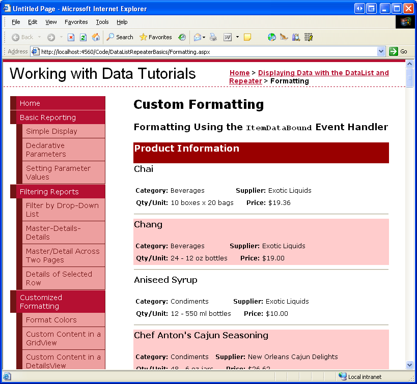 Una vez completado el ItemDataBound controlador de eventos, vuelva a visitar la Formatting.aspx página en un explorador. Como se muestra en la figura 2, esos productos con un precio inferior a 20,00 USD tienen resaltado su nombre y precio.