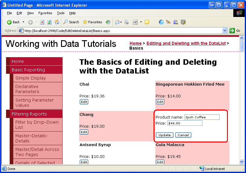 Aunque hemos agregado funcionalidades básicas de edición y eliminación a DataList, carece de características más avanzadas. Por ejemplo, no hay ninguna validación de campo de entrada: si un usuario escribe un precio demasiado caro, se Decimal.Parse producirá una excepción al intentar convertir Demasiado caro en Decimal. Del mismo modo, si hay un problema al actualizar los datos en las capas de lógica de negocios o acceso a datos, se mostrará al usuario la pantalla de error estándar. Sin ningún tipo de confirmación en el botón Eliminar, es muy probable eliminar accidentalmente un producto.