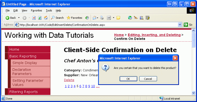 Después de hacer referencia al botón Eliminar en CommandField, a continuación se obtiene información sobre el producto enlazado a la fila GridView actual. Por último, establecemos la propiedad del OnClientClick botón Eliminar en el JavaScript adecuado, que incluye el nombre del producto. Dado que la cadena de JavaScript que se pasa a la confirm(string) función se delimita mediante apóstrofos, debemos escapar de los apóstrofos que aparecen dentro del nombre del producto. En concreto, los apóstrofos del nombre del producto se escapan con "\'".
