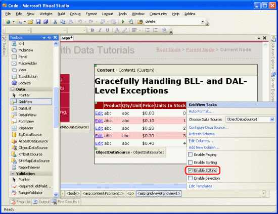 Por último, active la casilla Habilitar edición en la etiqueta inteligente de GridView. Después de completar estos pasos, el diseñador de la página debería parecerse a la figura 4 que se muestra en ErrorHandling.aspx.