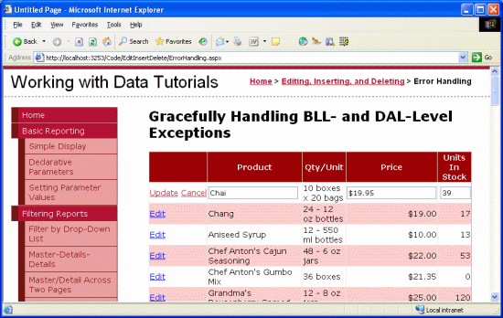 Mientras que el GridView editable funciona maravillosamente cuando los usuarios ingresan valores válidos para el nombre, el precio y las unidades disponibles del producto editado, ingresar valores ilegales da como resultado una excepción. Por ejemplo, si se omite el valor ProductName, se produce una NoNullAllowedException, ya que la propiedad ProductName en la clase ProductsRow tiene su propiedad AllowDBNull establecida en false; si la base de datos está inactiva, TableAdapter lanzará una SqlException al intentar conectarse a la base de datos. Sin realizar ninguna acción, estas excepciones se propagan desde la capa de acceso a datos hasta la capa lógica de negocios, a continuación, a la página de ASP.NET y, por último, al entorno de ejecución de ASP.NET.