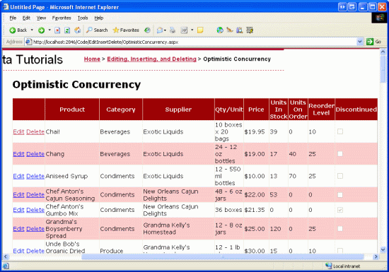 Hay varios enfoques para implementar la simultaneidad optimista (consulte La lógica de actualización de simultaneidad optimista de Peter A. Bromberg para obtener una breve visión de una serie de opciones). El DataSet tipado de ADO.NET proporciona una implementación que se puede configurar simplemente marcando una casilla. Al habilitar la simultaneidad optimista para un TableAdapter en el DataSet Tipado, se aumentan las instrucciones de UPDATE y DELETE para incluir una comparación de todos los valores originales en la cláusula WHERE. La instrucción siguiente UPDATE , por ejemplo, actualiza el nombre y el precio de un producto solo si los valores de base de datos actuales son iguales a los valores que se recuperaron originalmente al actualizar el registro en GridView. Los @ProductName parámetros y @UnitPrice contienen los nuevos valores especificados por el usuario, mientras @original_ProductName que y @original_UnitPrice contienen los valores que originalmente se cargaron en GridView cuando se hizo clic en el botón Editar: