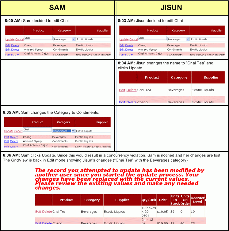 Por ejemplo, imagine que dos usuarios, Jisun y Sam, estaban visitando una página en nuestra aplicación que permitía a los visitantes actualizar y eliminar los productos a través de un control GridView. Ambos hacen clic en el botón Editar de GridView aproximadamente al mismo tiempo. Jisun cambia el nombre del producto a "Chai Tea" y hace clic en el botón Actualizar. El resultado neto es una UPDATE instrucción que se envía a la base de datos, que establece todos los campos actualizables del producto (aunque Jisun solo ha actualizado un campo, ProductName). En este momento, la base de datos tiene los valores "Chai Tea", la categoría Bebidas, el proveedor Exotic Liquids, y así sucesivamente para este producto en particular. Sin embargo, la GridView en la pantalla de Sam todavía muestra el nombre del producto en la fila GridView editable como "Chai". Unos segundos después de confirmar los cambios de Jisun, Sam actualiza la categoría a Condiments y hace clic en Actualizar. Esto da como resultado una UPDATE instrucción enviada a la base de datos que establece el nombre del producto en "Chai", el CategoryID al identificador de la categoría de Bebidas correspondiente, etc. Los cambios de Jisun en el nombre del producto han sido reemplazados. En la figura 1 se muestra gráficamente esta serie de eventos.