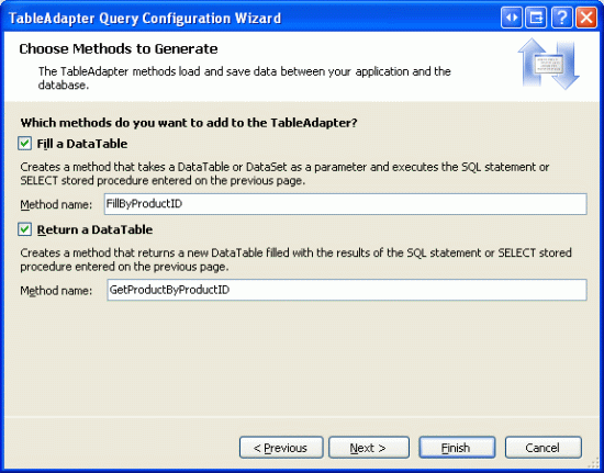 Por último, cambie los nombres de método generados por FillByProductID y GetProductByProductID.