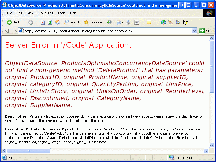 Después de resolver este problema, intente hacer clic en el botón Eliminar de nuevo para cualquier producto. Esta vez obtendrá un InvalidOperationException cuando el ObjectDataSource intente invocar el método UpdateProduct de la BLL.