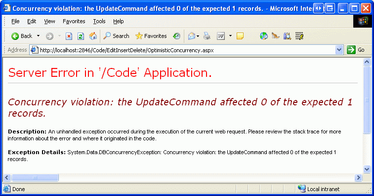Figura 17: Cuando se detecta una infracción de simultaneidad, se produce una DBConcurrencyException excepción (haga clic para ver la imagen de tamaño completo).