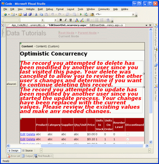 Cuando se produce una infracción de simultaneidad, el comportamiento mostrado depende de si se usó la actualización por lotes de la DAL o el patrón directo de base de datos. En nuestro tutorial se usan ambos patrones, con el patrón de actualización por lotes que se usa para actualizar y el patrón directo de base de datos que se usa para eliminar. Para empezar, vamos a agregar dos controles Web de etiqueta a nuestra página que explican que se produjo una infracción de simultaneidad al intentar eliminar o actualizar datos. Establezca las propiedades `Visible` y `EnableViewState` del control Label en `false`; esto hará que se oculten en cada visita de página, excepto para aquellas visitas a páginas concretas donde su propiedad `Visible` esté establecida mediante programación en `true`.