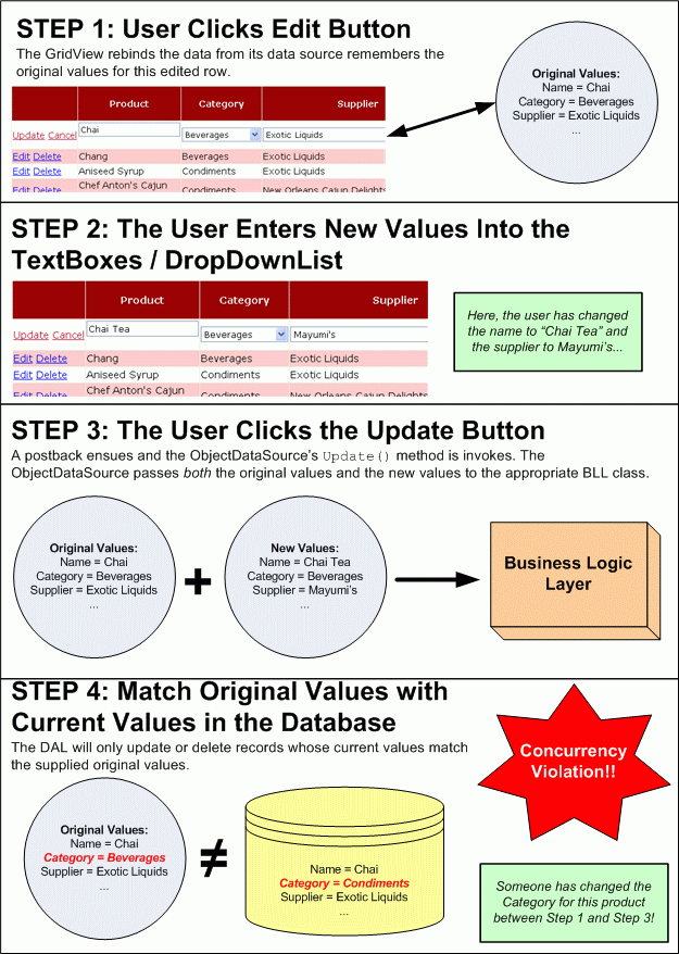 El control de simultaneidad optimista funciona asegurándose de que el registro que se actualiza o elimina tiene los mismos valores que cuando se inicia el proceso de actualización o eliminación. Por ejemplo, al hacer clic en el botón Editar de una gridView editable, los valores del registro se leen de la base de datos y se muestran en cuadros de texto y otros controles web. GridView guarda estos valores originales. Más adelante, después de que el usuario realice sus cambios y haga clic en el botón Actualizar, los valores originales más los nuevos valores se envían a la capa de lógica de negocios y, a continuación, a la capa de acceso a datos. La capa de acceso a datos debe emitir una instrucción SQL que solo actualizará el registro si los valores originales que el usuario inició la edición son idénticos a los valores que todavía están en la base de datos. En la figura 2 se muestra esta secuencia de eventos.