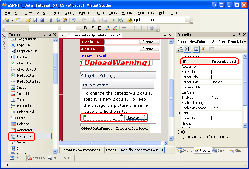 Figura 17: Agregar un control FileUpload a EditItemTemplate (Haga clic para ver la imagen de tamaño completo)