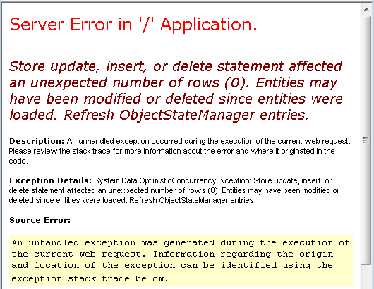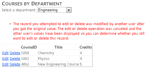Ejecute la página y vuelva a crear un conflicto de simultaneidad. Esta vez verá un mensaje de error:
