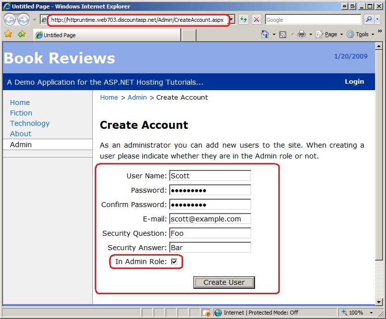 Recuerde que en un tutorial anterior se actualizó la aplicación web Críticas de libros para incluir una carpeta ~/Admin y esta carpeta se ha configurado para permitir solo a los usuarios en el rol de administrador. He agregado una página a esa carpeta denominada CreateAccount.aspx desde la que un administrador puede crear una nueva cuenta de usuario. En esta página se usa el control CreateUserWizard para mostrar la interfaz de usuario y la lógica de back-end para crear una nueva cuenta de usuario. Además, personalicé el control para incluir una CheckBox que pregunta si el nuevo usuario también debe agregarse al rol de administrador (consulte la ilustración 5). Con un poco de trabajo, puede crear un conjunto personalizado de páginas que implemente las tareas relacionadas con la administración de roles y el usuario que, de lo contrario, se proporcionaría mediante la WSAT.