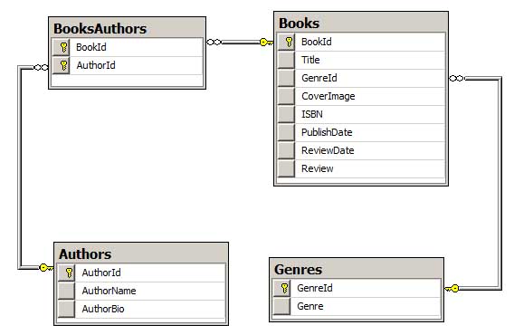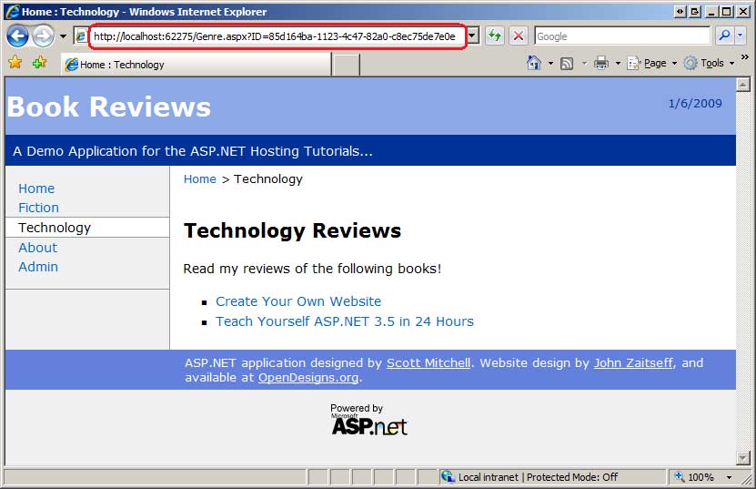 La versión anterior del sitio web de reseñas de libros tenía una página ASP.NET independiente para cada libro. Por ejemplo, hubo una página denominada ~/Tech/TYASP35.aspx que contenía la revisión de Teach Yourself ASP.NET 3.5 in 24 Hours. Esta nueva versión controlada por datos del sitio web tiene las revisiones almacenadas en la base de datos y una sola página ASP.NET, Review.aspx?ID=bookId, que muestra la reseña del libro especificado. Del mismo modo, hay una página Genre.aspx?ID=genreId que enumera los libros reseñados en el género especificado.