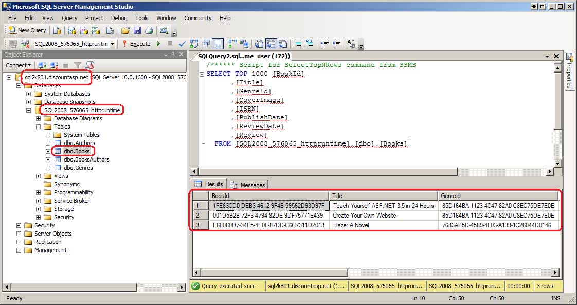 Como se indicó anteriormente en este tutorial, la base de datos del sitio web opiniones de libros es una base de datos de SQL Server 2008 Express Edition almacenada en la carpeta App_Data. Sería tan sencillo como copiar la carpeta App_Data del entorno de desarrollo en el entorno de producción. Sin embargo, la mayoría de los proveedores de host web no admiten el hospedaje de bases de datos en la carpeta App_Data por motivos de seguridad. En su lugar, los hosts web proporcionan una cuenta en un servidor de base de datos de SQL Server dentro de su entorno. La implementación de la base de datos desde el entorno de desarrollo en el entorno de producción requiere la obtención de la base de datos registrada en el servidor de bases de datos del host web.