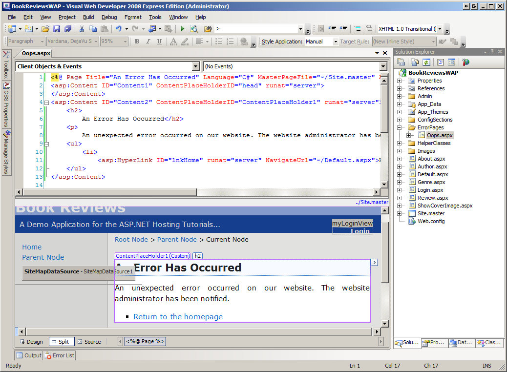 Cada aplicación web debe tener una página de error personalizada. Proporciona una alternativa más profesional a la YSOD de error en tiempo de ejecución, es fácil de crear y configurar la aplicación para usar la página de error personalizada solo tarda unos instantes. El primer paso consiste en crear la página de error personalizada. He agregado una nueva carpeta a la aplicación Opiniones de libros denominada ErrorPages y se ha agregado a esa nueva página de ASP.NET denominada Oops.aspx. Haga que la página use la misma página maestra que el resto de las páginas del sitio para que herede automáticamente la misma apariencia.