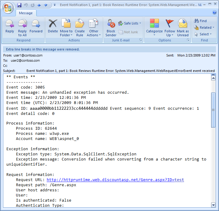 En la ilustración 2 se muestra el correo electrónico generado por la clase SimpleMailWebEventProvider al visitar Genre.aspx?ID=foo.