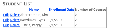 En la expresión Eval, puede hacer referencia a la propiedad de navegación StudentGrades. Dado que esta propiedad contiene una colección, tiene una propiedad Count que se puede usar para mostrar el número de cursos en los que está inscrito el alumno. En un tutorial posterior, verá cómo mostrar datos de propiedades de navegación que contienen entidades únicas en lugar de colecciones (tenga en cuenta que no puede usar elementos BoundField para mostrar datos de las propiedades de navegación).