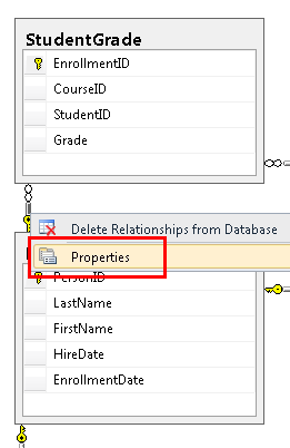 En el Explorador de servidores, abra el diagrama de base de datos que creó en la parte 1. Haga clic con el botón derecho en la relación entre Person y StudentGrade (la línea entre tablas) y, a continuación, seleccione Propiedades.