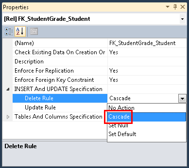 En la ventana Propiedades, expanda Especificación de INSERT y UPDATE y establezca la propiedad DeleteRule en Cascada.
