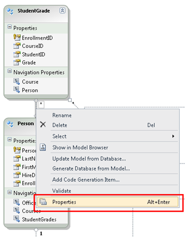 Para asegurarse de que el modelo mantiene las entidades que están en memoria sincronizadas con lo que está haciendo la base de datos, debe establecer las reglas correspondientes en el modelo de datos. Abra SchoolModel.edmx, haga clic con el botón derecho en la línea de asociación entre Person y StudentGrade y, a continuación, seleccione Propiedades.