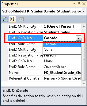 En la ventana Propiedades, establezca End1 OnDelete en Cascada.