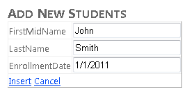 Este marcado crea un control EntityDataSource similar al que creó en Students.aspx, salvo que habilita la inserción. Al igual que con el control GridView, los campos enlazados del control DetailsView se codifican exactamente igual que lo harían para un control de datos que se conecta directamente a una base de datos, excepto que hacen referencia a propiedades de entidad. En este caso, el control DetailsView solo se usa para insertar filas, por lo que ha establecido el modo predeterminado en Insert.