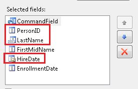 En el cuadro Campos seleccionados, elimine PersonID, LastName y HireDate. Normalmente no muestra una clave de registro para los usuarios, la fecha de contratación no es relevante para los alumnos y colocará ambas partes del nombre en un campo, por lo que solo necesita uno de los campos de nombre.