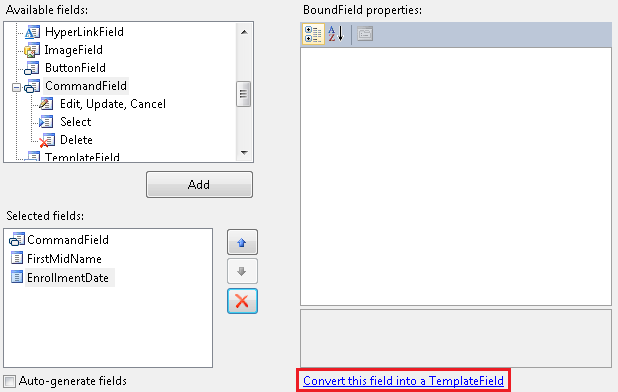 Seleccione el campo FirstMidName y, a continuación, haga clic en Convertir este campo en un campo TemplateField.