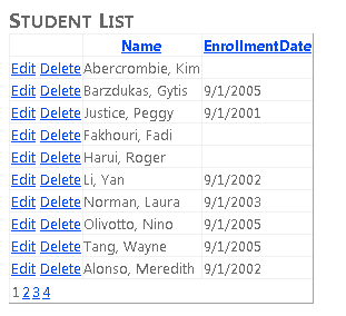 El botón Eliminar también funciona. Haga clic en Eliminar para una fila que tenga una fecha de inscripción y la fila desaparecerá (las filas sin fecha de inscripción representan a profesores y puede obtener un error de integridad referencial; en el siguiente tutorial, filtrará esta lista para incluir solo a los alumnos).