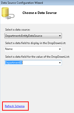 En el paso Elija un origen de datos, seleccione DepartmentsEntityDataSource como origen de datos, haga clic en Actualizar esquema y, a continuación, seleccione Nombre como campo de datos para mostrar y DepartmentID como campo de datos de valor. Haga clic en OK.