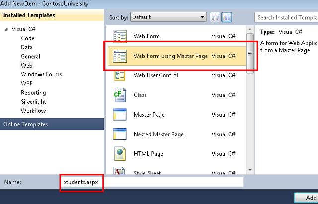 Cree una página web con la plantilla Formulario web con página maestra y asígnele el nombre Students.aspx.