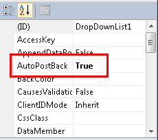 Cuando el usuario cambia el departamento seleccionado en la lista desplegable, quiere que la lista de cursos asociados cambie automáticamente. Para ello, seleccione la lista desplegable y, en la ventana Propiedades, establezca la propiedad AutoPostBack en True.