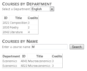 Ejecute la página. La presentación inicial muestra una lista de todos los cursos en orden por departamento y, a continuación, por título del curso.